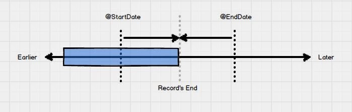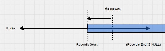 Case 3: Record’s end IS NULL (i.e. still currently active) and record’s start is less than the end of the date range